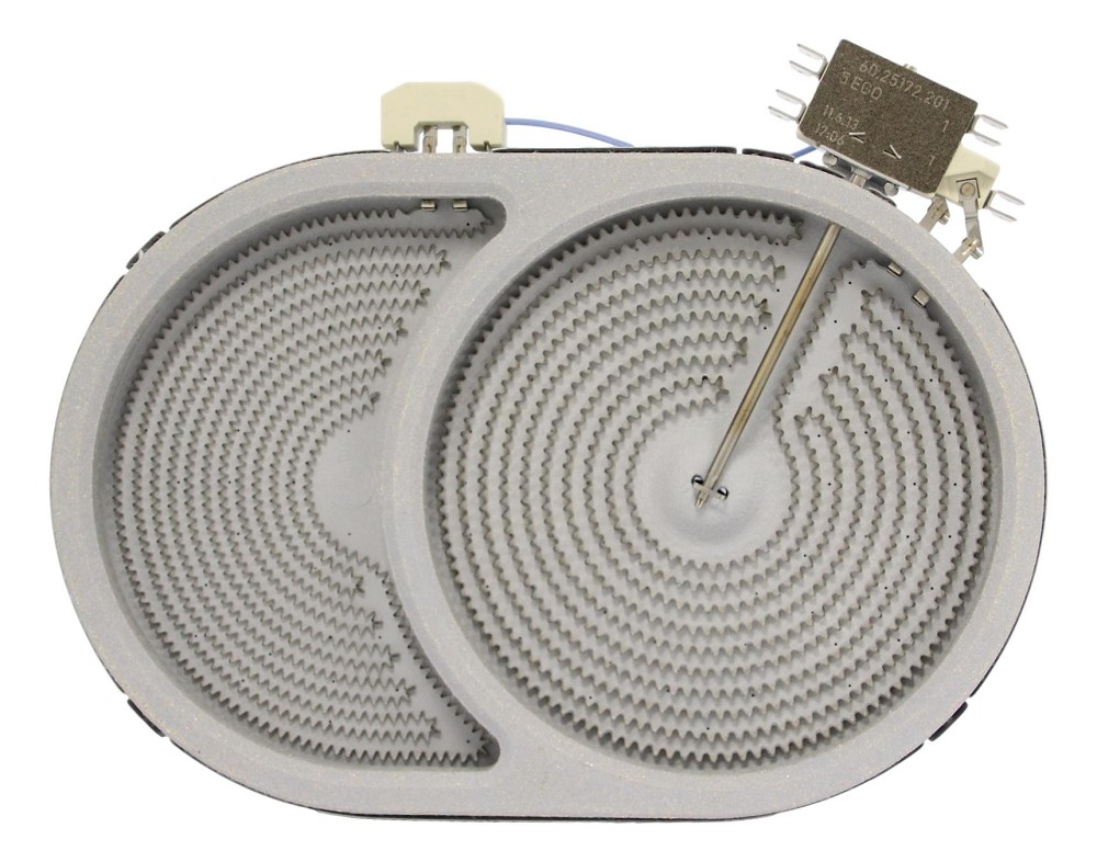 Der E.G.O. (EGO) Zweikreis-HiLight-Heizkörper mit der Artikelnummer 10.57413.688 (auch bekannt als 1057413688) bietet eine Gesamtleistung von 2.400 Watt, aufgeteilt in zwei Heizkreise. Der erste Heizkreis liefert 1.600 Watt, während der zweite Heizkreis 800 Watt zur Verfügung stellt. Das Heizelement ist oval geformt und verfügt über Steckanschlüsse mit einer Größe von 6 mm.