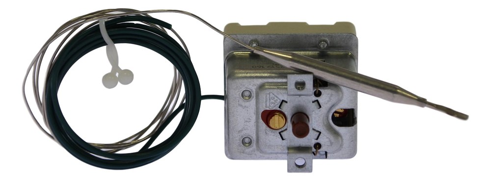Der 3-polige Schutz-Temperatur-Begrenzer von E.G.O. (EGO) ist fest eingestellt auf eine Abschalttemperatur von 95°C mit einer Toleranz von -12K. Er verfügt über ein Kapillarrohr mit einer Länge von 2040 mm, davon sind 1250 mm isoliert. Der Fühler hat eine Länge von 73 mm und einen Durchmesser von 6 mm. Dieser Temperaturbegrenzer wird ohne Stopfbuchse geliefert.